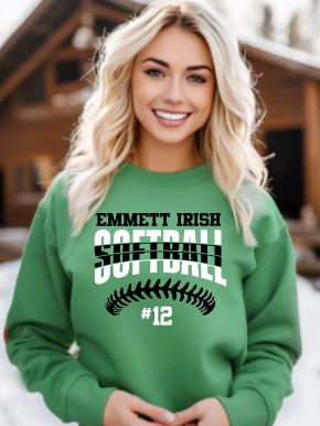 Emmett Irish Softball With Stitch Number Included shirt, available on unisex softsyle tee, long sleeve, crewneck sweatshirt, hoodie, or dri-fit. Please leave the number for the front design in the NOTES section.