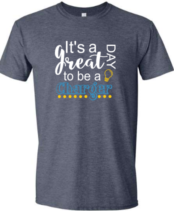 It's A Great Day To Be A Charger shirt, available on unisex sized tee, long sleeve, crewneck, hoodie, or tank. Print is dependent on shirt color.
