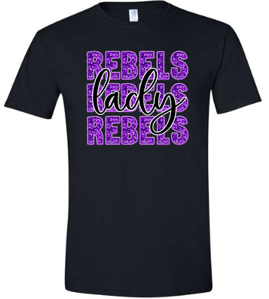Lady Rebels Faux Glitter Stacked Rebels print, available on unisex softsyle shirt.