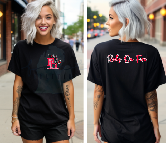 Port Huron High School Competitive Cheer Chest Logo Red's On Fire print and Sleeve or Back Print. If you choose a Tee it is automatically a back print. Long Sleeves have choice of Sleeve or Back.