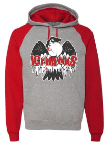 Port Huron Icehawks Colorblock raglan red with oxford gray hoodie sweatshirt. This comes standard with the Full Size Logo. If you'd like a different print on this hoodie, please leave the name of the print you'd like in the NOTES section.