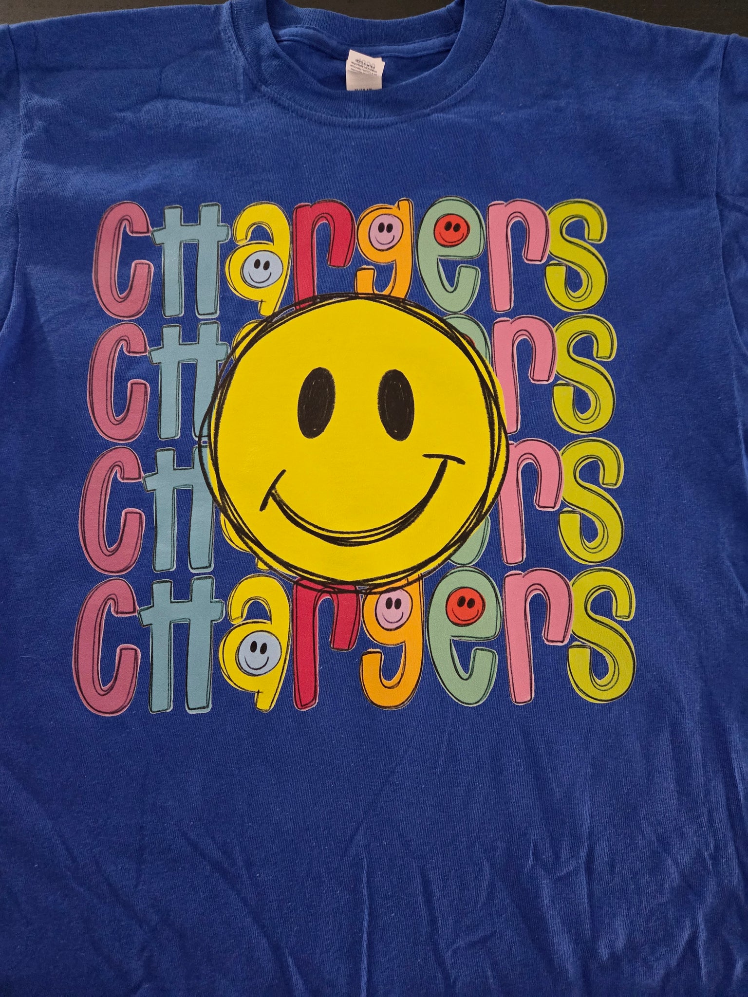 Stacked Chargers Smiley shirt, available on unisex sized tee, long sleeve, crewneck, hoodie, or tank.